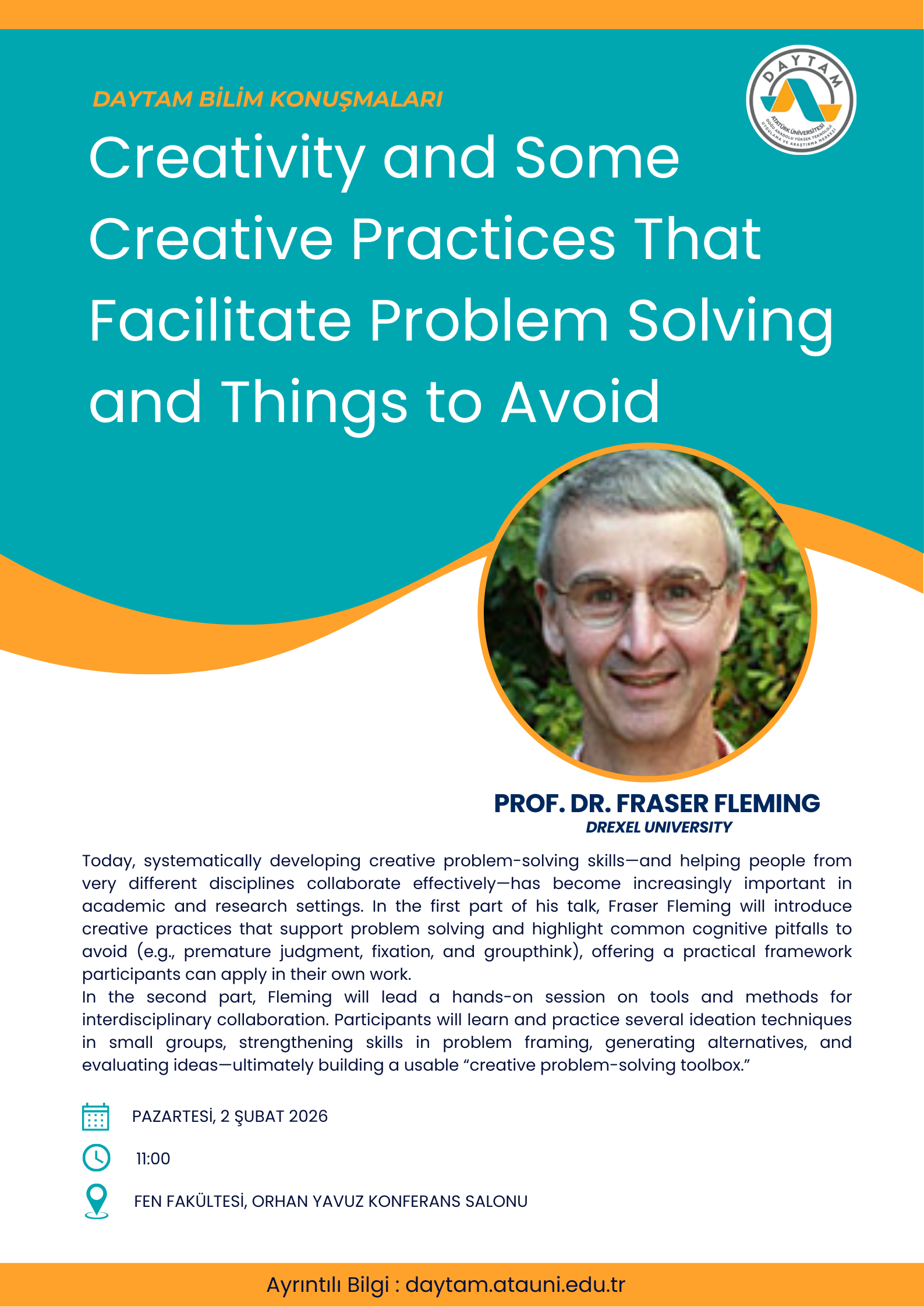 Today, systematically developing creative problem-solving skills—and helping people from very different disciplines collaborate effectively—has become increasingly important in academic and research settings. In the first part of his talk, Fraser Fleming will introduce creative practices that support problem solving and highlight common cognitive pitfalls to avoid (e.g., premature judgment, fixation, and groupthink), offering a practical framework participants can apply in their own work.
